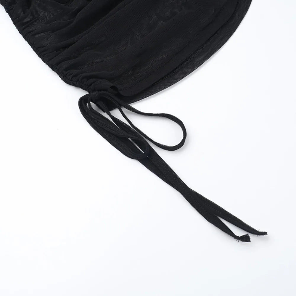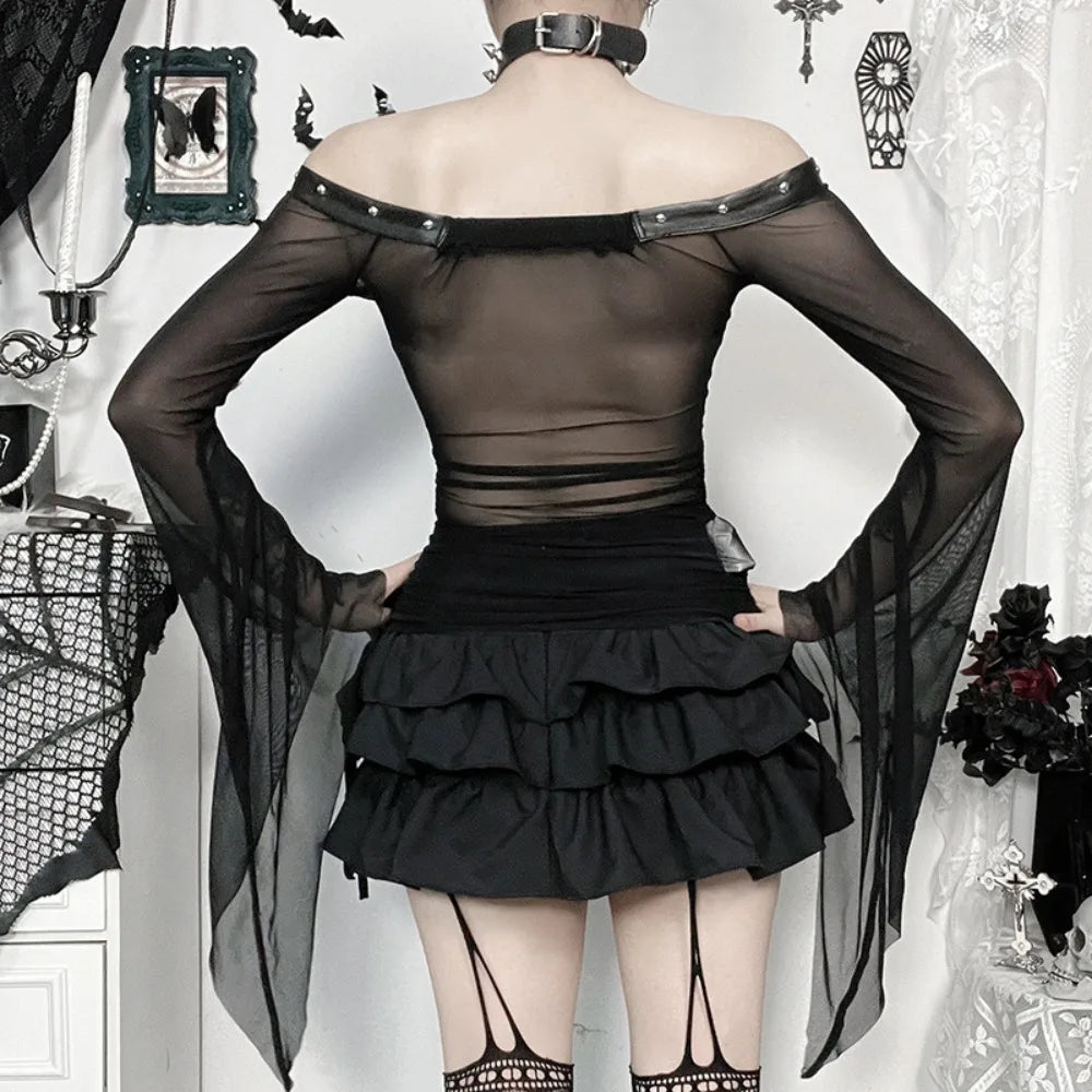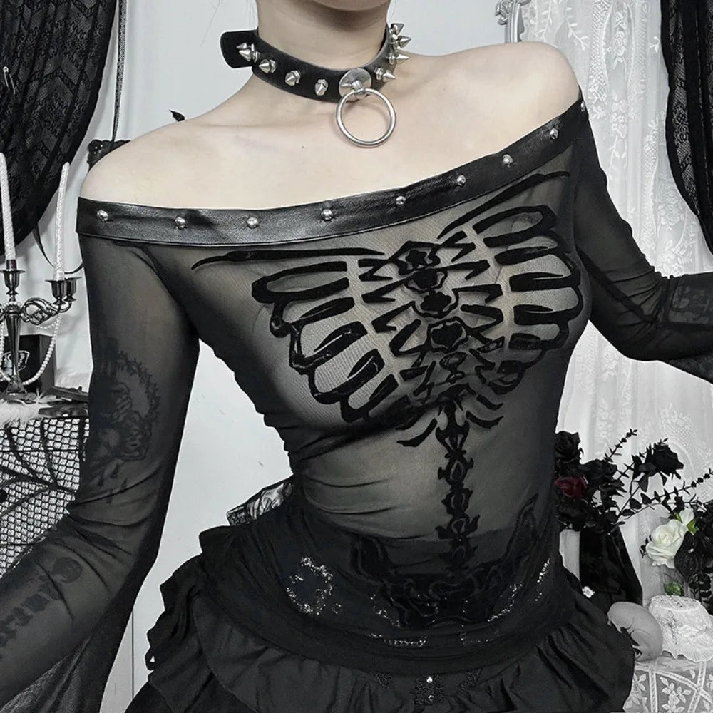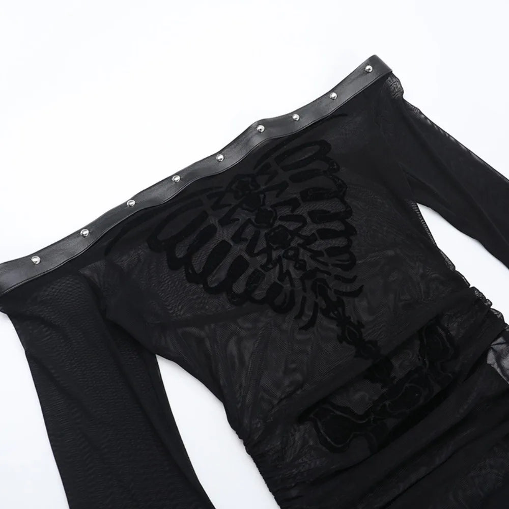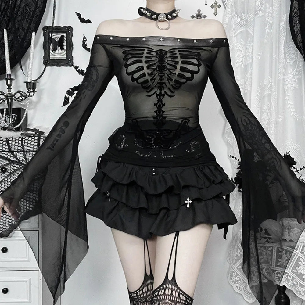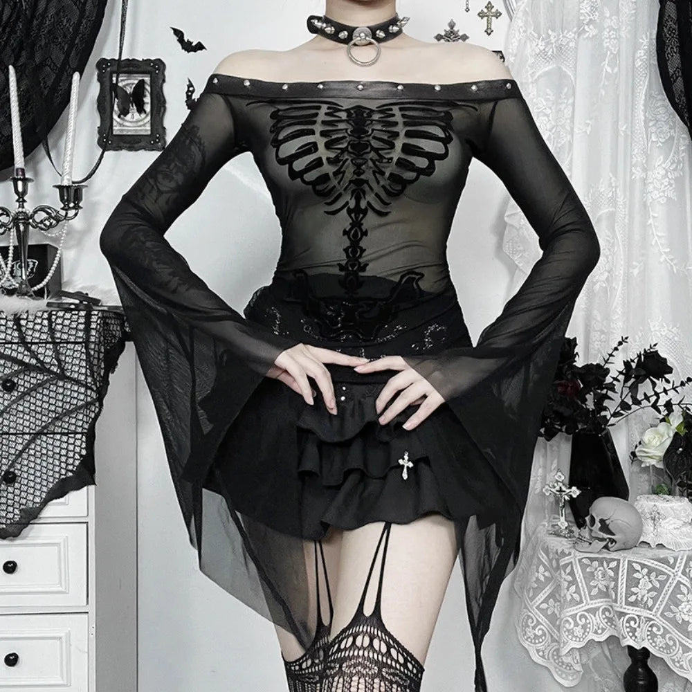 Flocked Skull Print Bell Sleeve Mesh Top