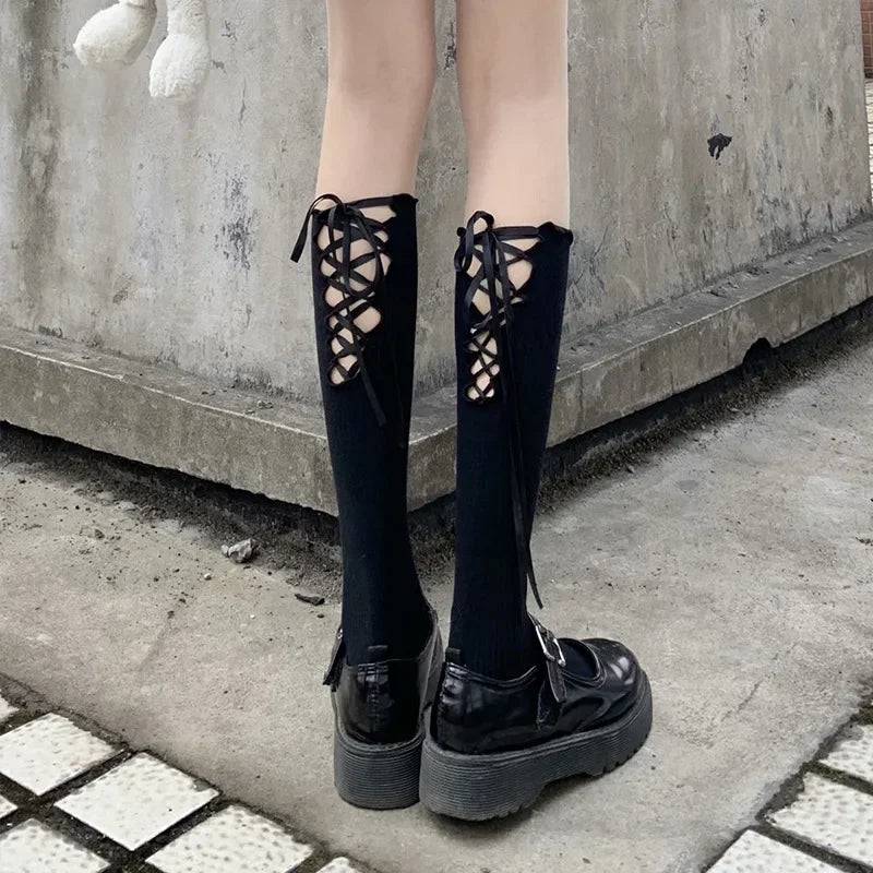 Gothic Black Calf Straps Hollow Sock