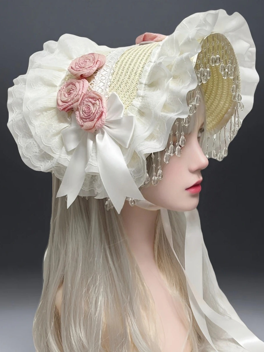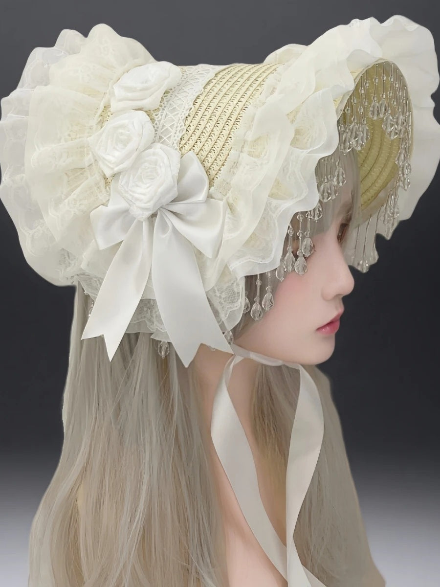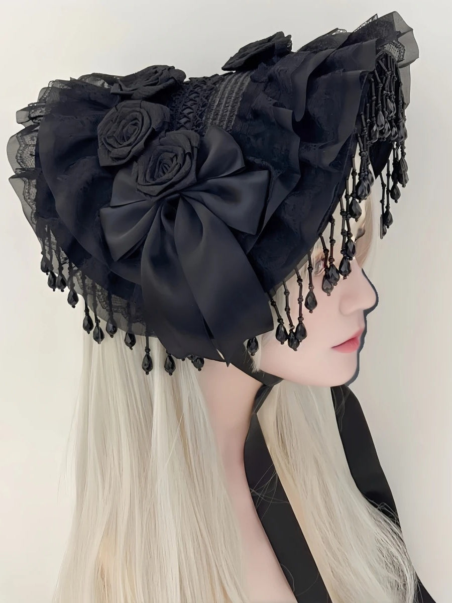 Gothic Lolita Black Pearl Tassel Lace Bow Feather Hat