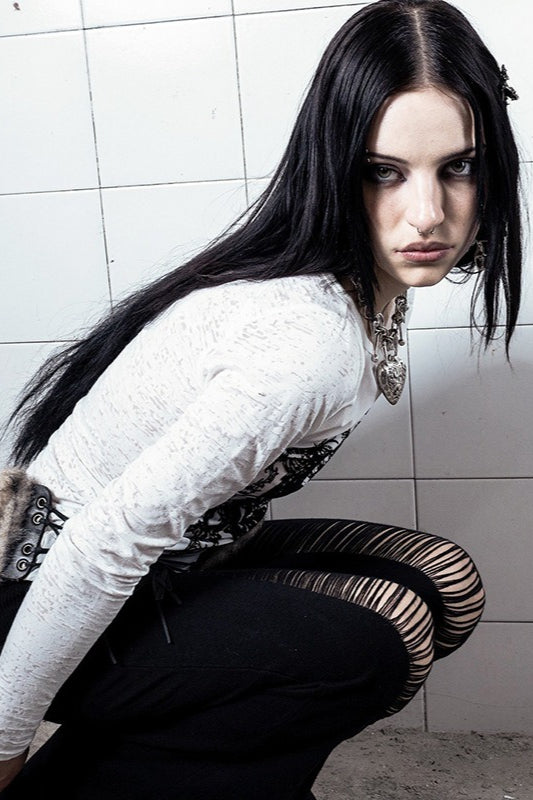 Gothic Print Slim Lace Patchwork Long Sleeve Mesh Top