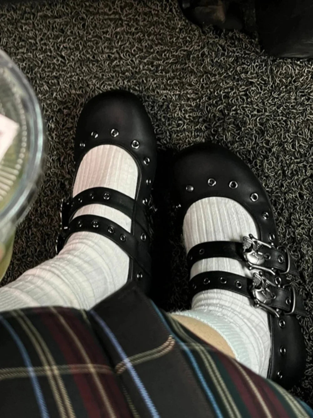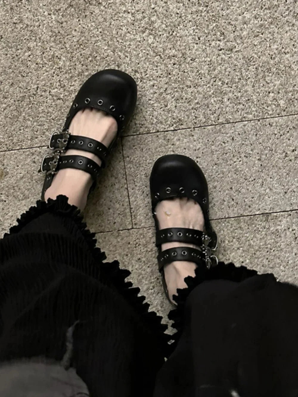 Gothic Punk Style Double Buckle Skull Rivet Flat Ballet Flat