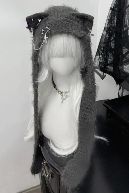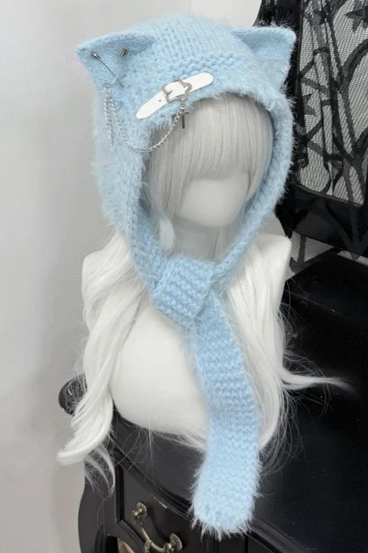 Harajuku Cat Ear Cross Chain Leather Buckle Knitted Winter Hat