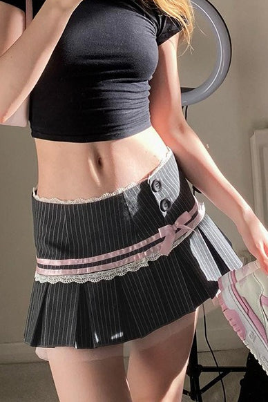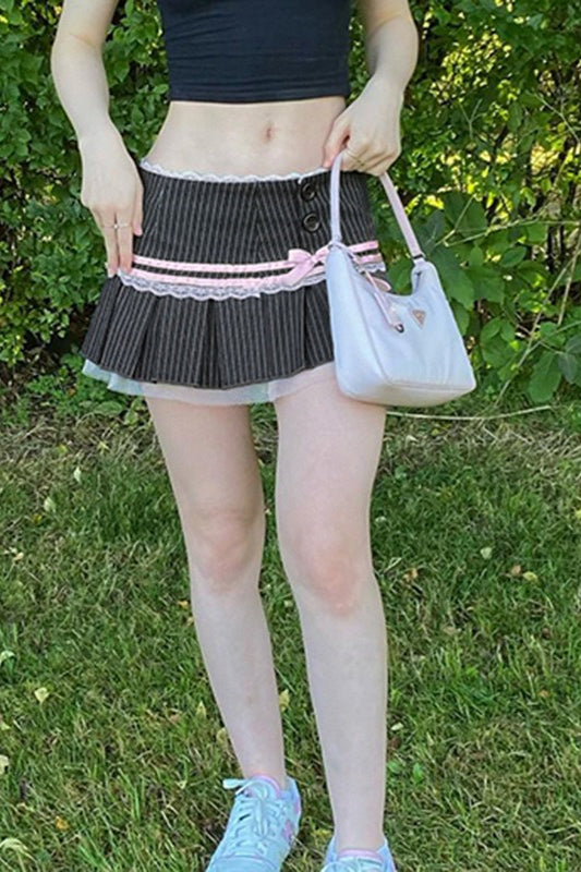 Increase quantity for Spice Striped Bow Lace Pleated Patchwork Mini Skirt