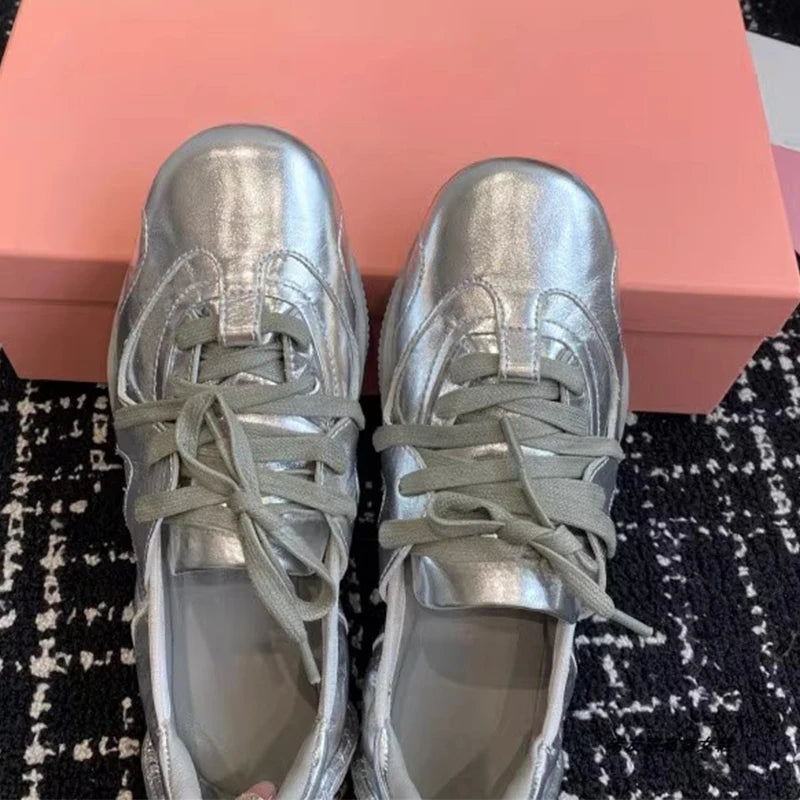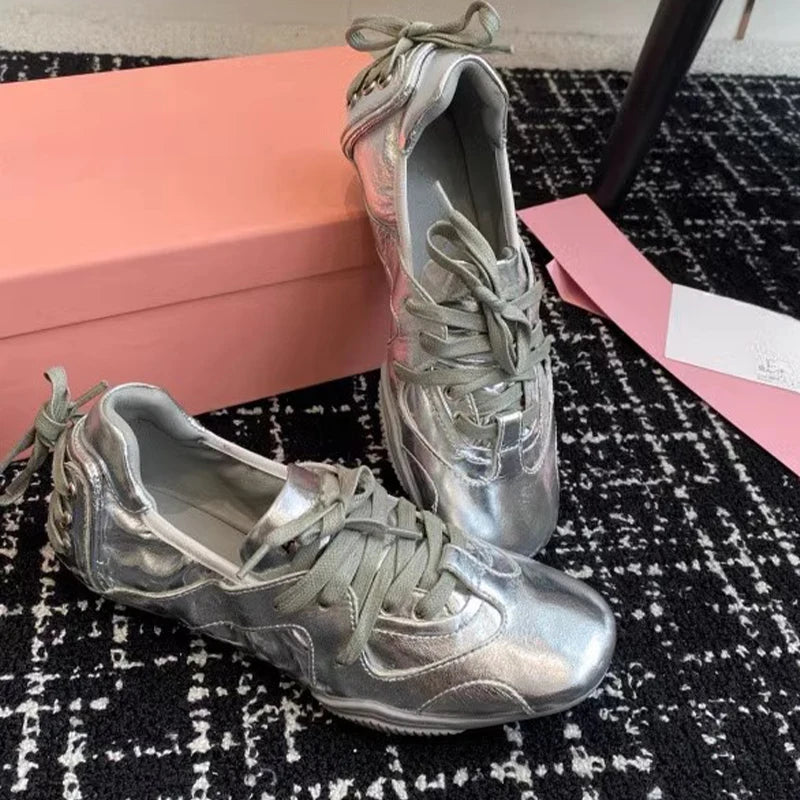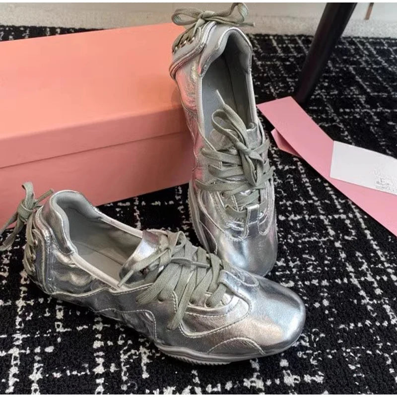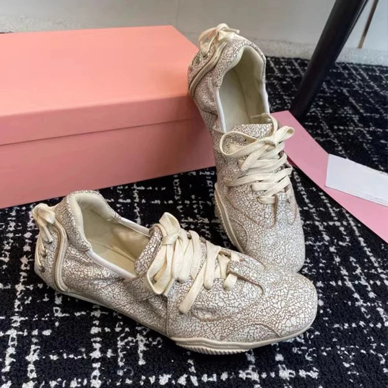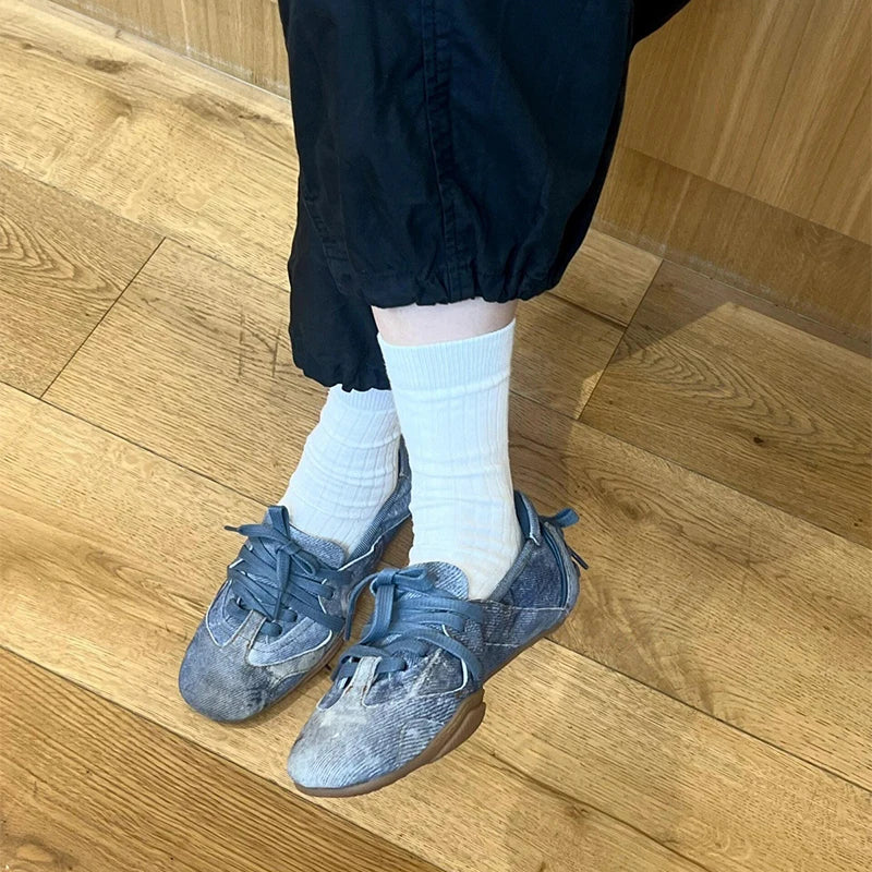 Vintage Denim Lace-Up Blue Pearl Bow Flat