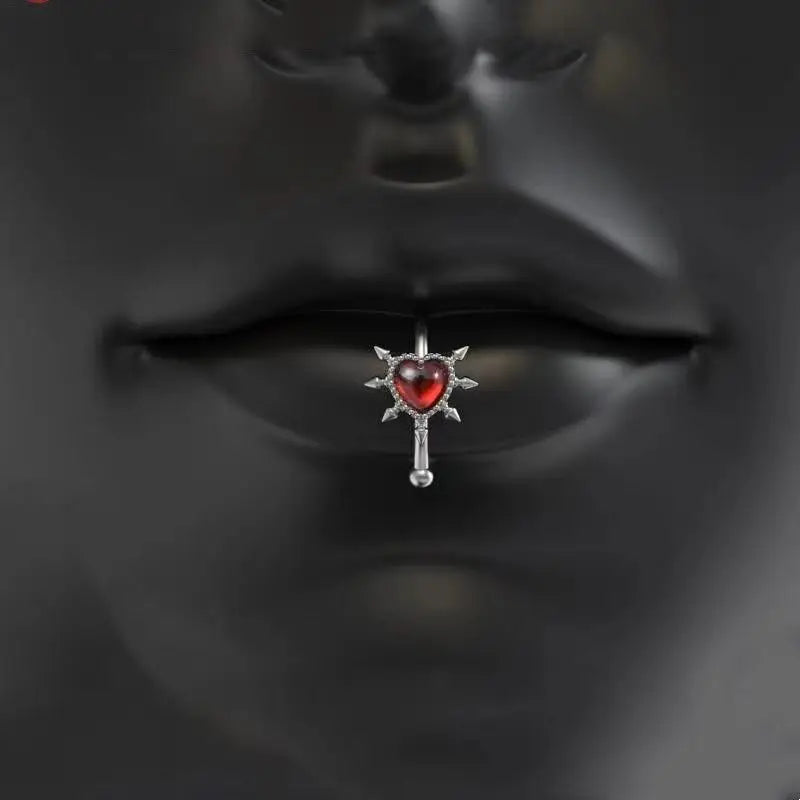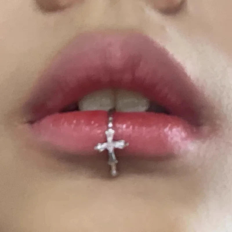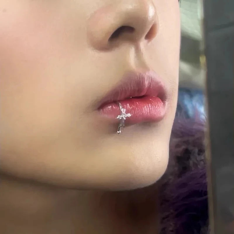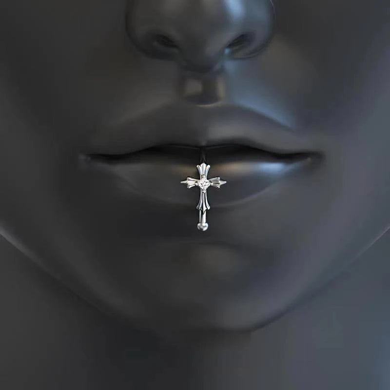White Zirconia Cross Silver Punk Lip Stud